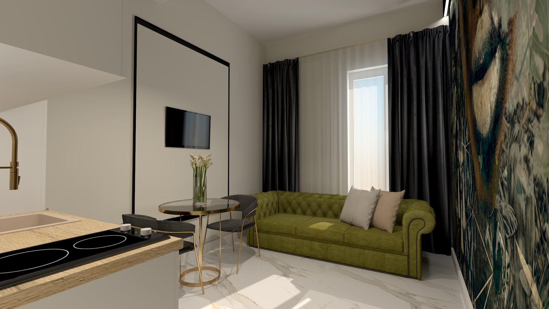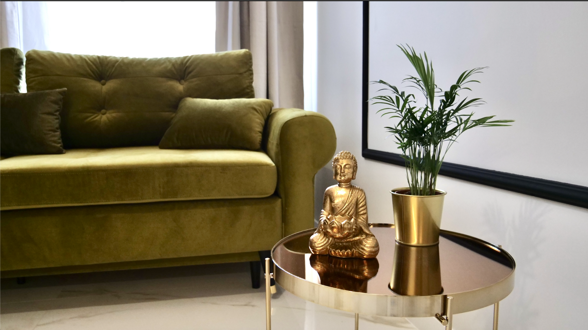 -luksusowy, modny i przytulny salon z aksamitną welurową sofą